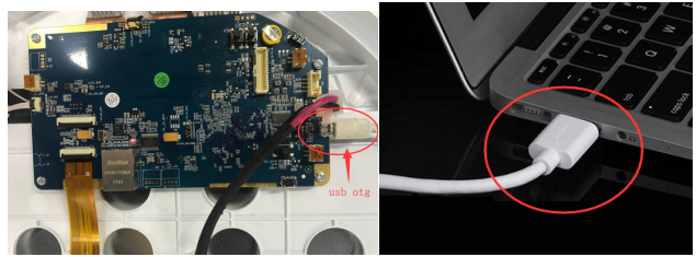 Remove the back cover next to the “emergency stop” button on the robot. Connect the hdmi port with the word "TEST" on it with the hide end, and then connect the robot to the usbm end, as shown in the figure below.